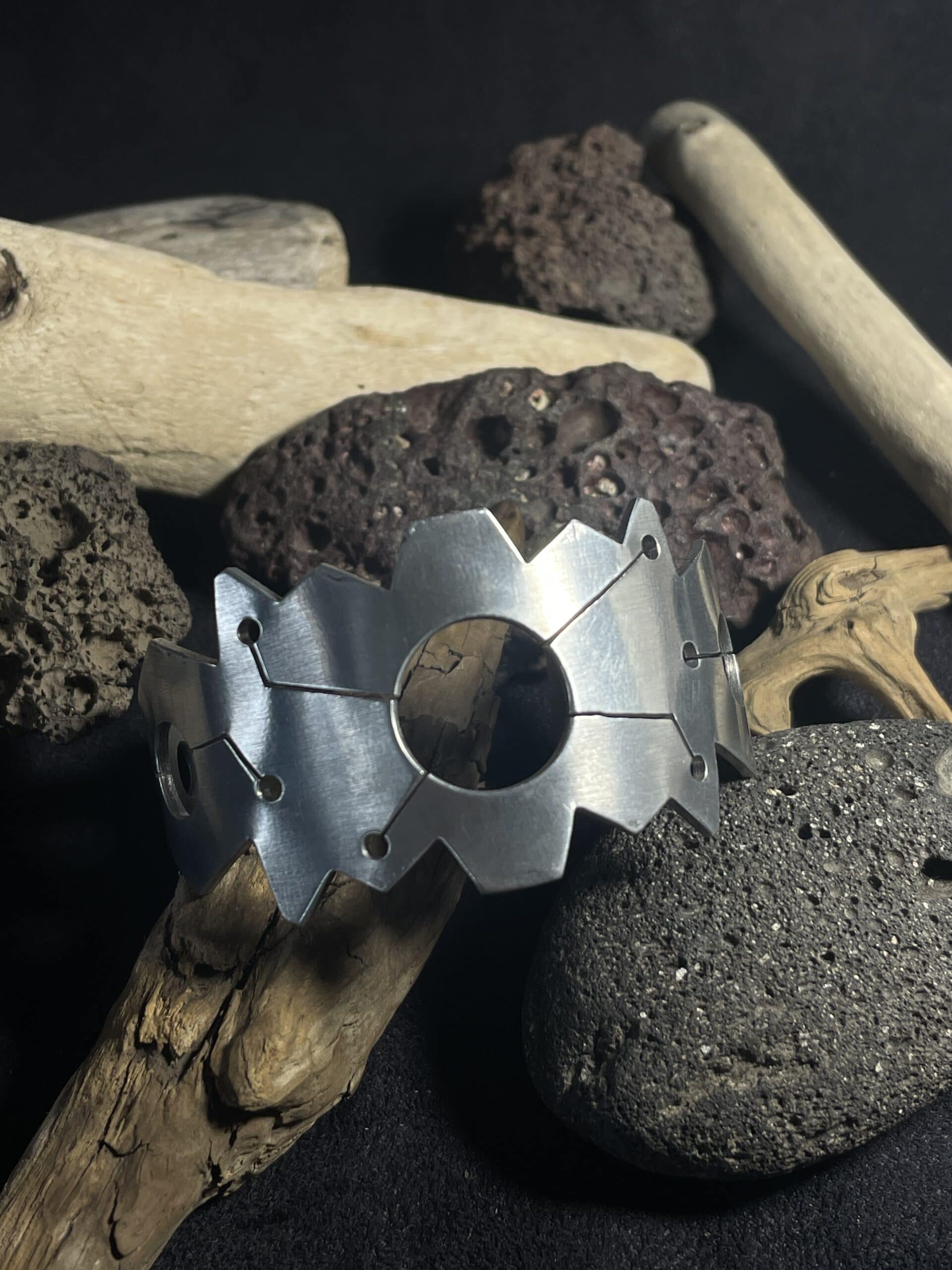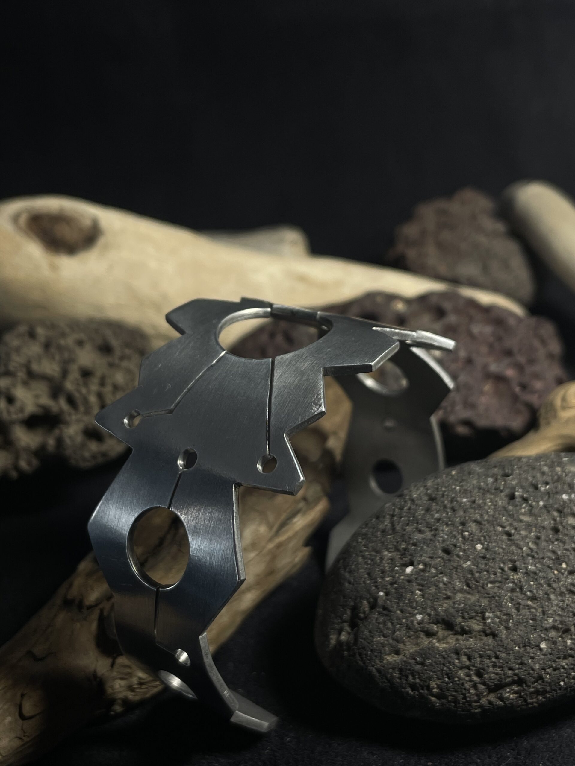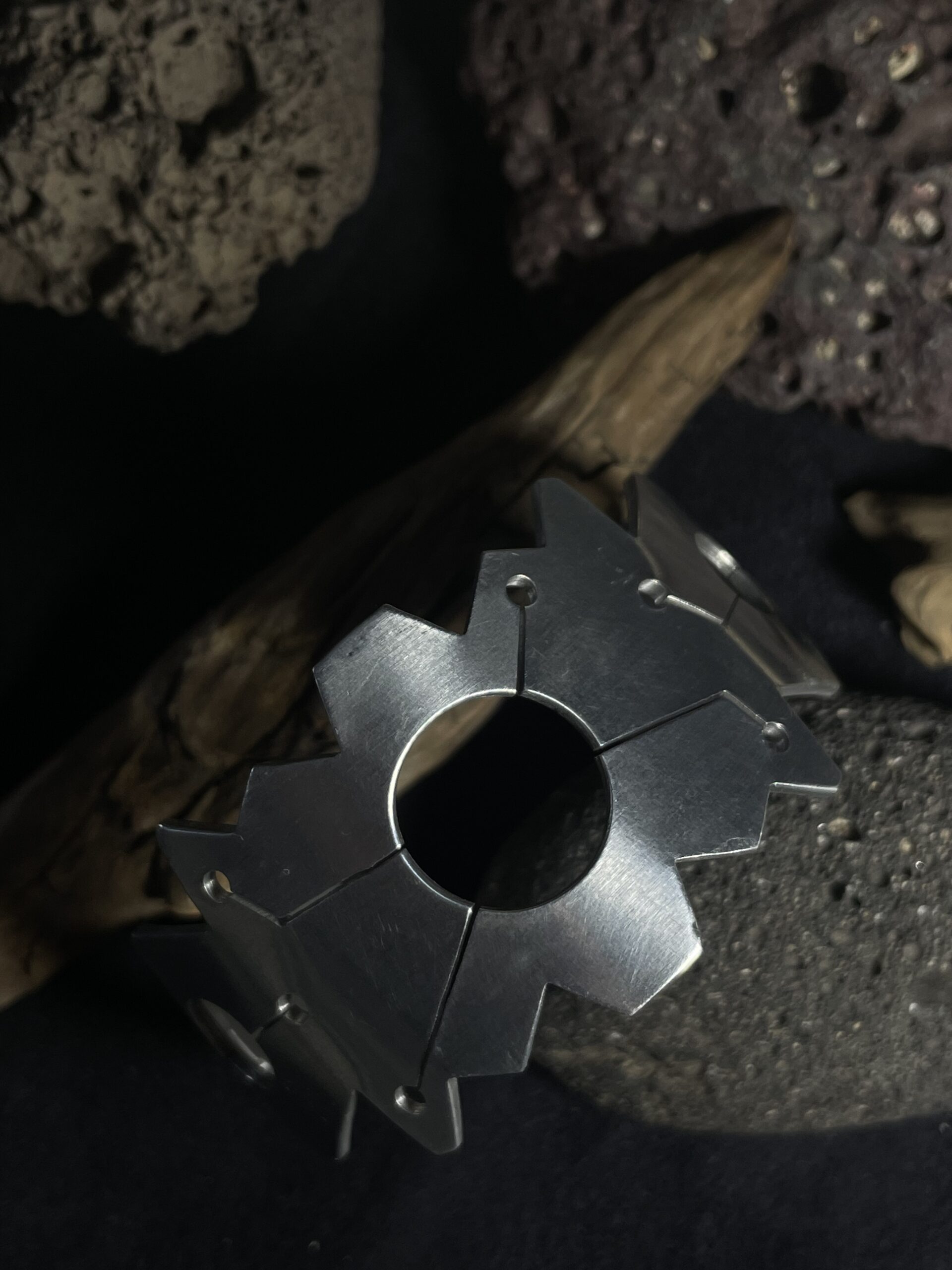 Dans la collection PRISM, cette manchette révèle des découpes asymétriques organisées autour d’une ouverture centrale, mettant en valeur la carnation de celui ou celle qui la porte.