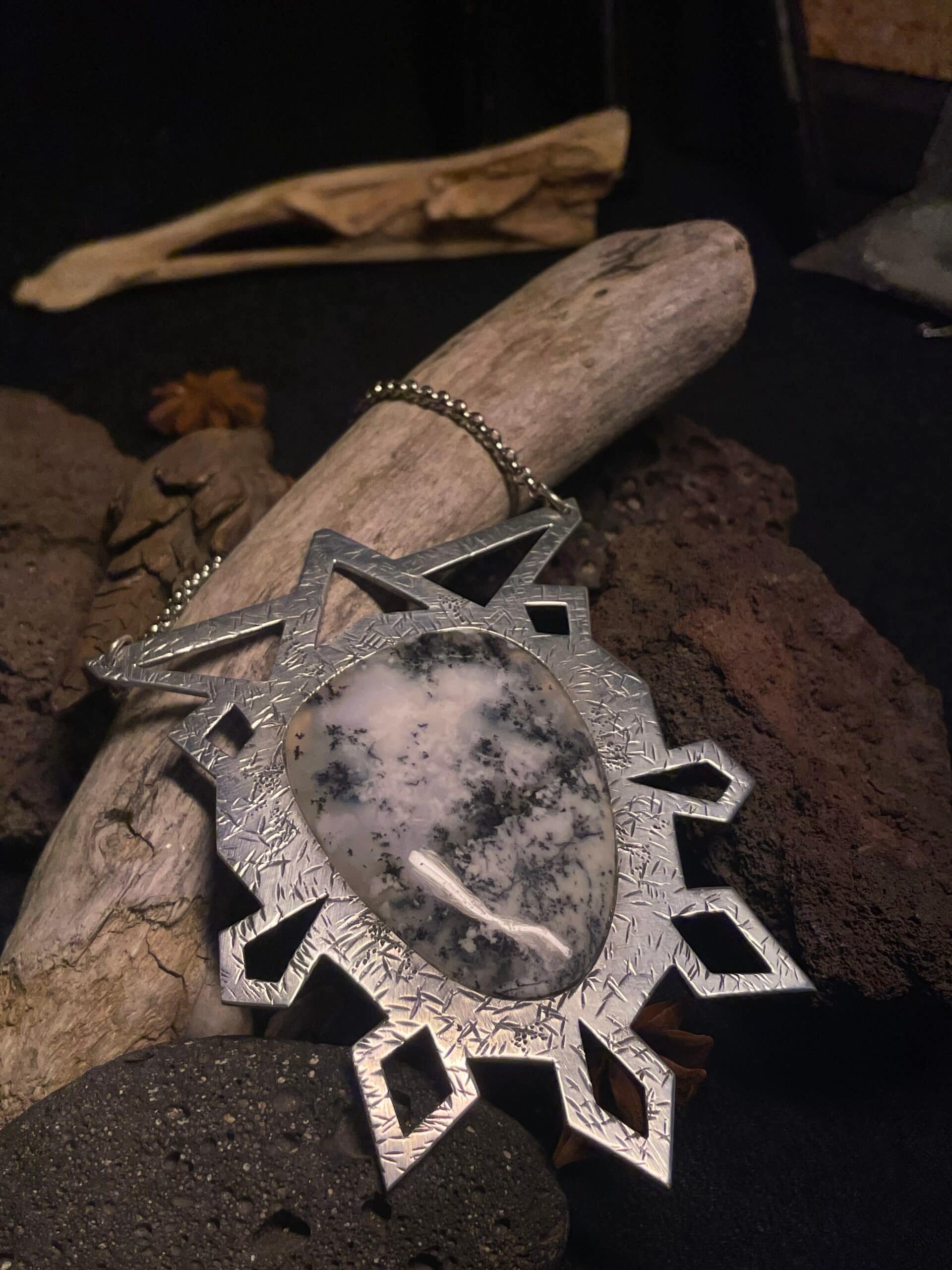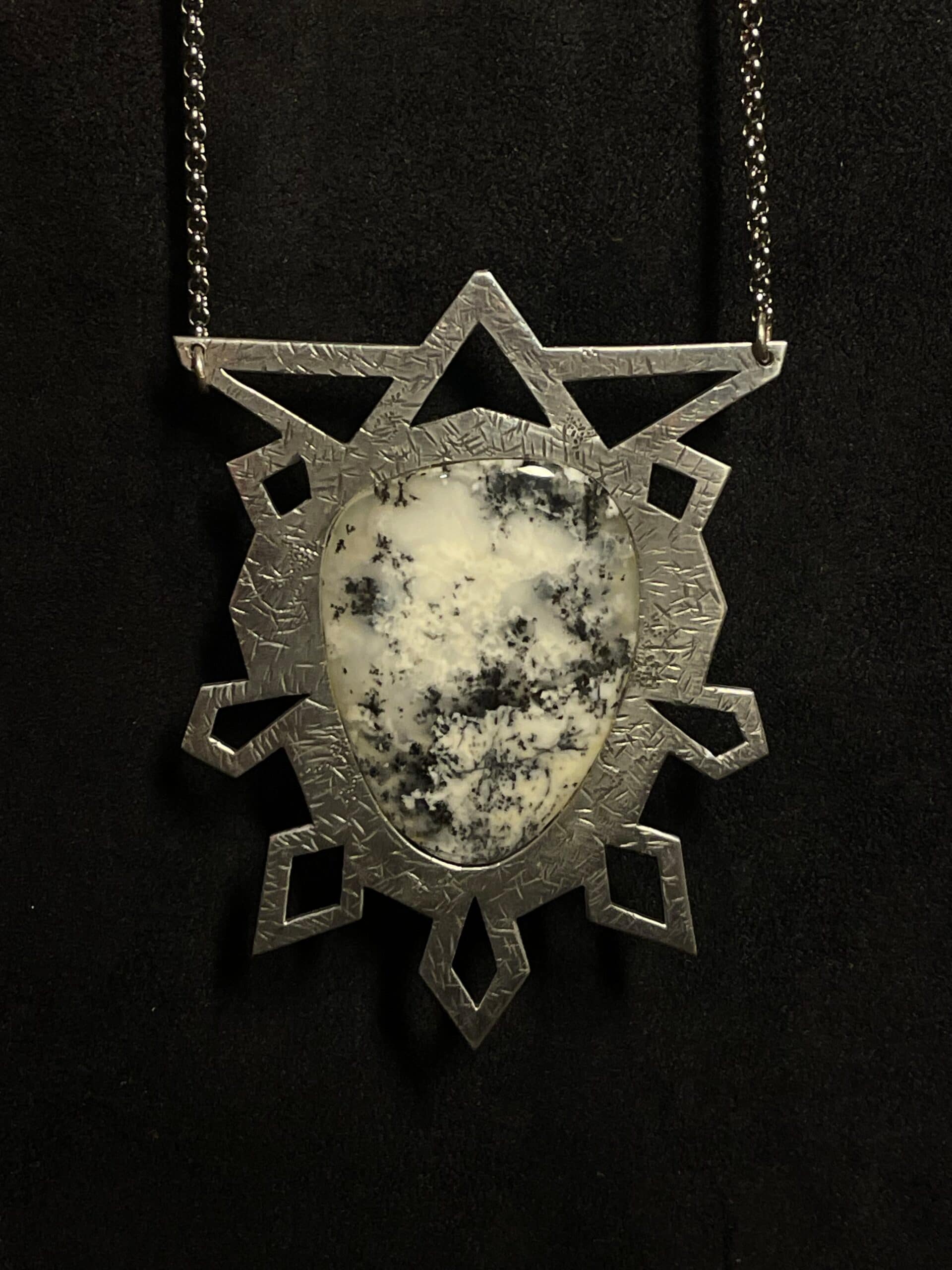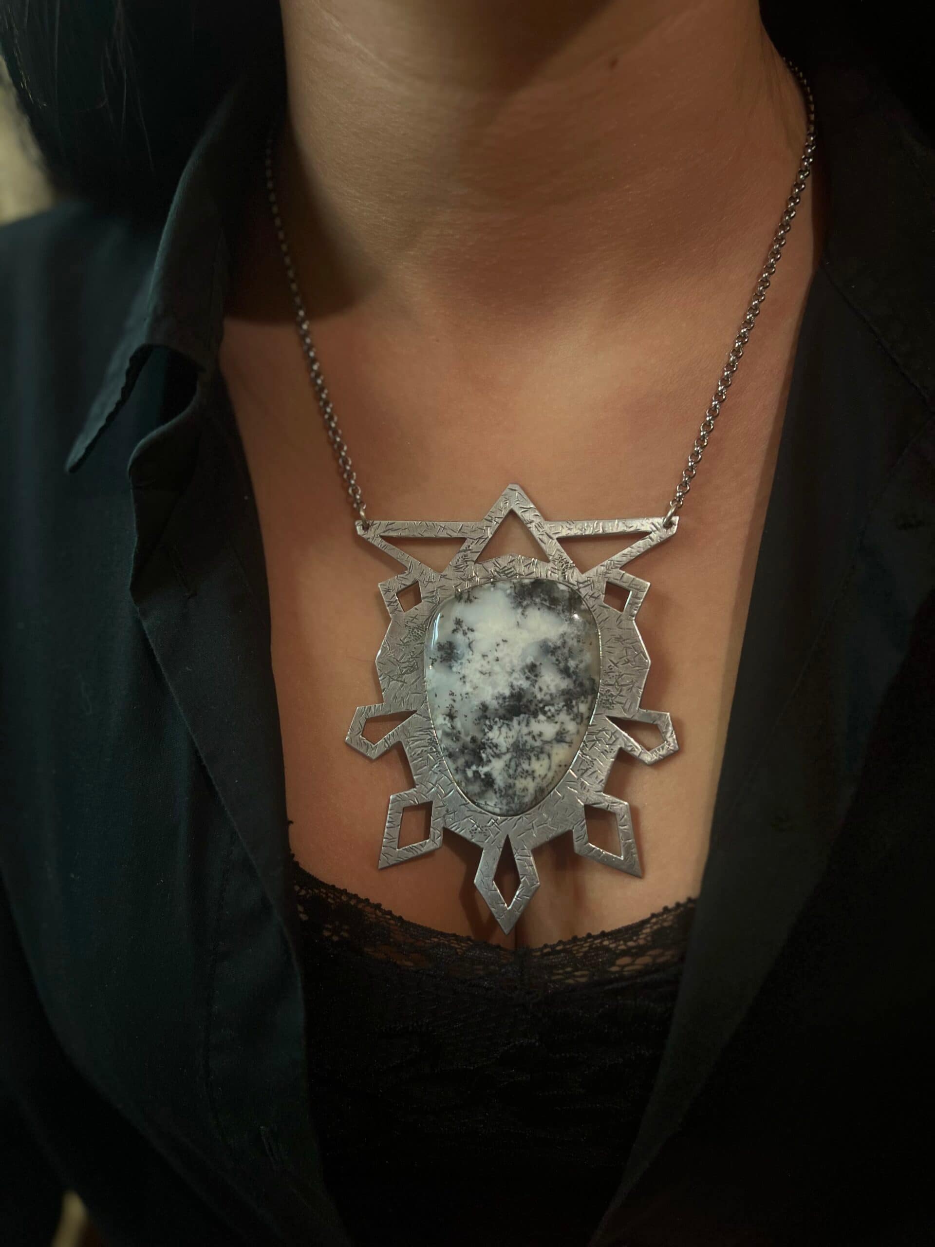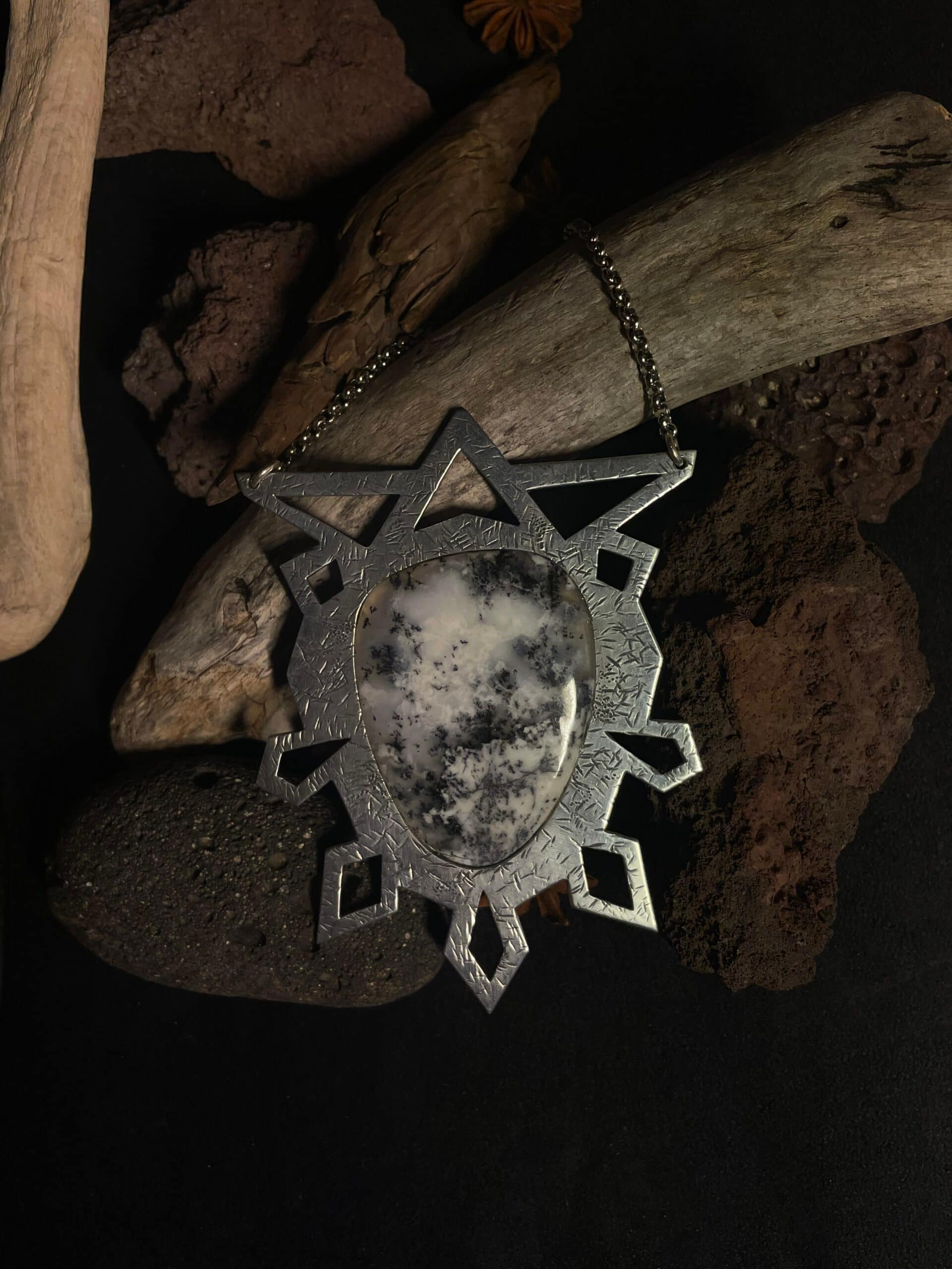 Ce pendentif massif joue avec la lumière et le volume, tout en offrant une monture forte et sculpturale qui met en valeur un cabochon d’agate dendritique, dont les motifs rappellent des paysages gelés.