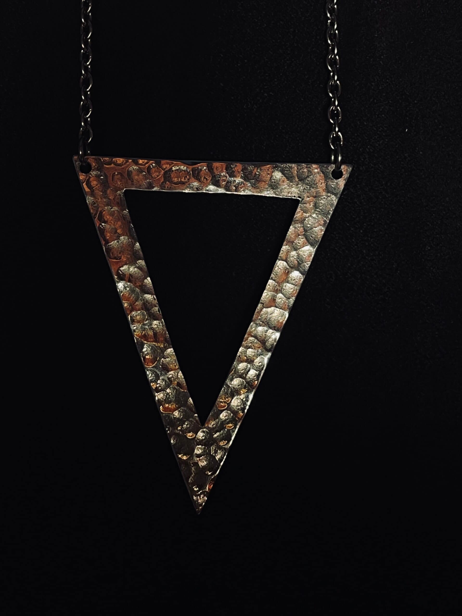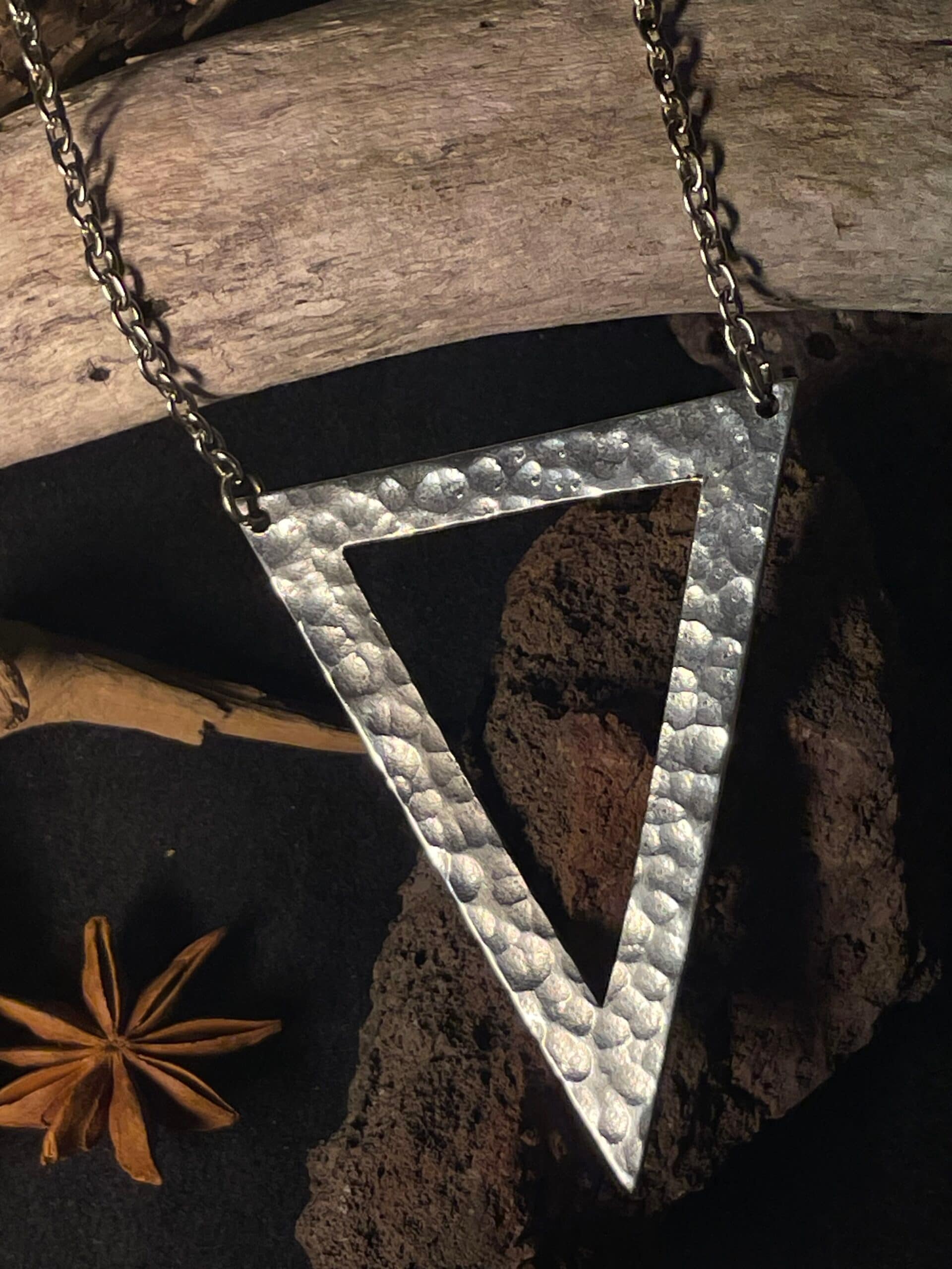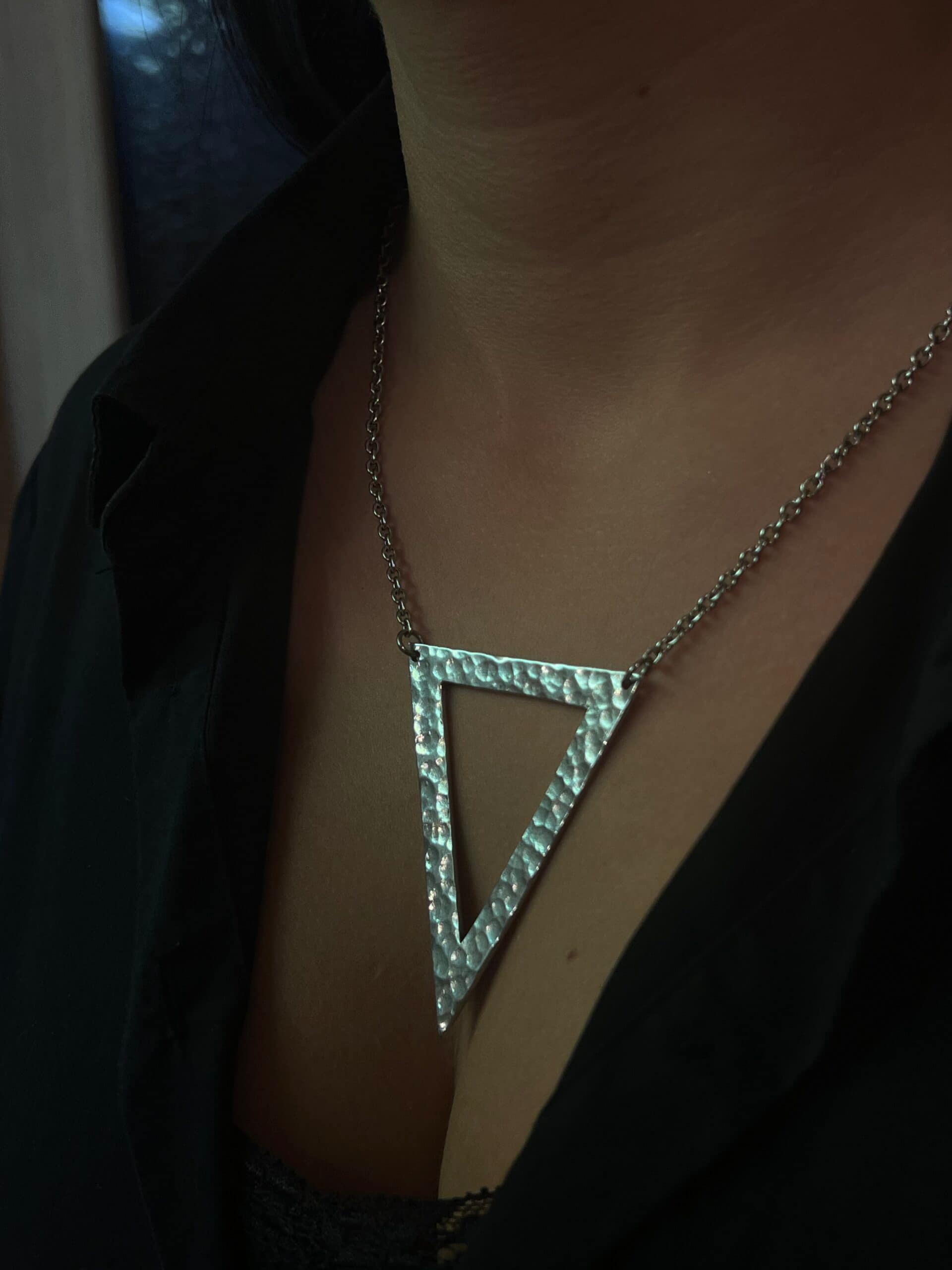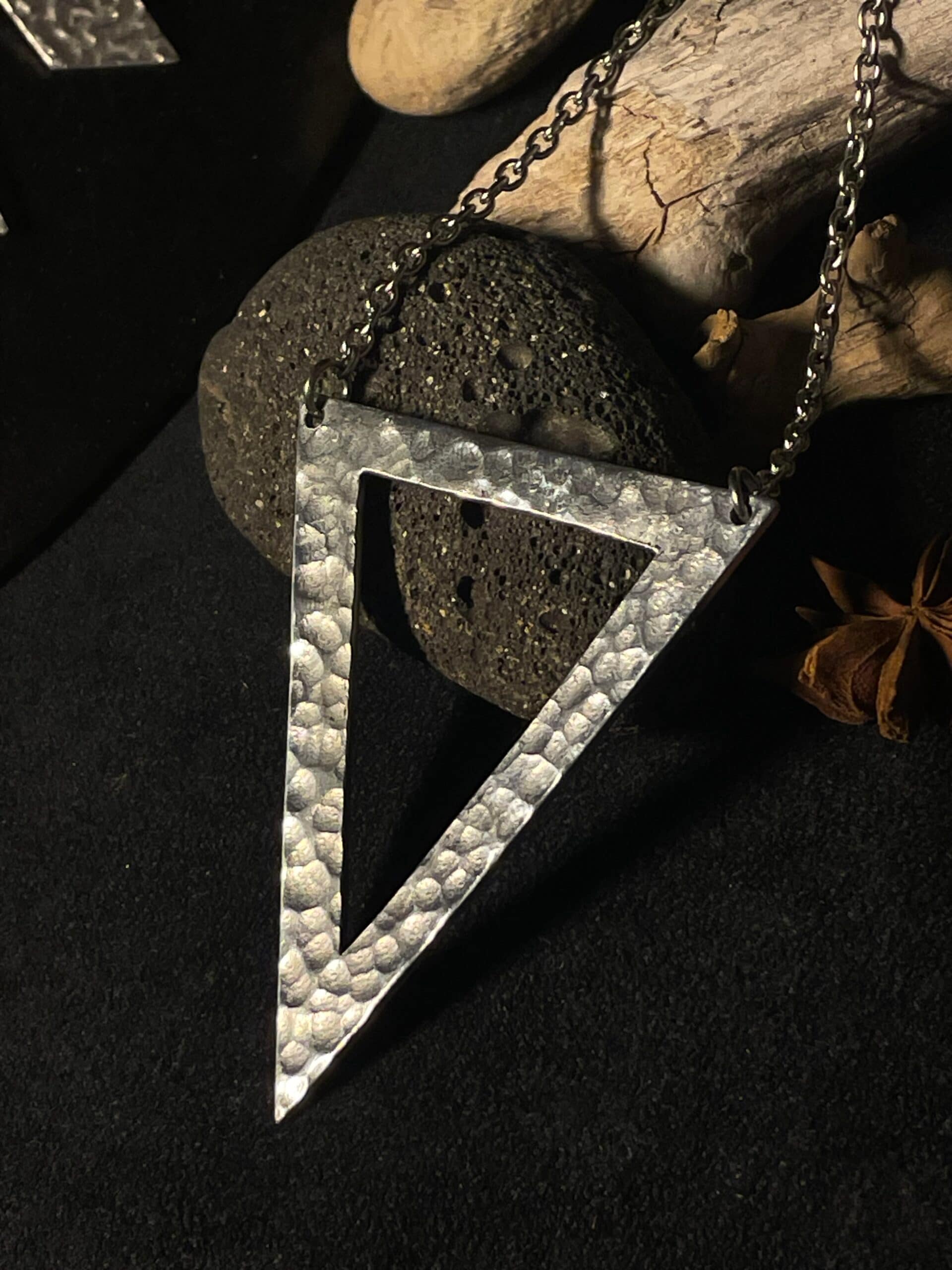 Ce pendentif adopte un aspect épuré tout en conservant les impacts irréguliers du martelage. Ses lignes franches créent un point central massif qui structure le décolleté.