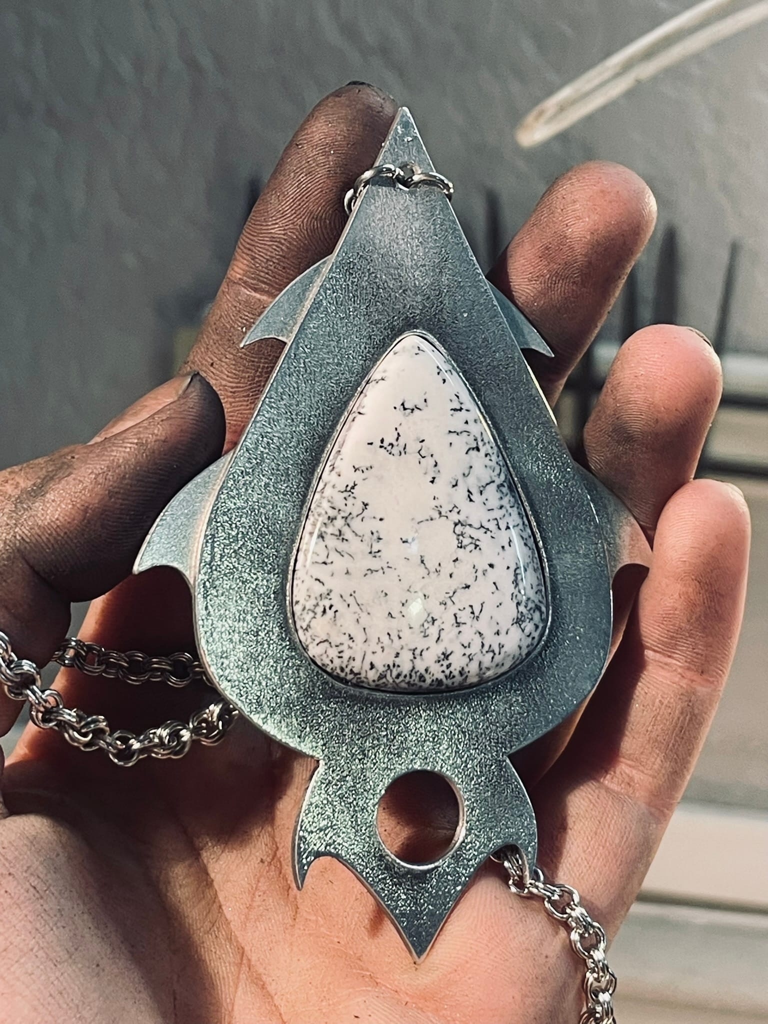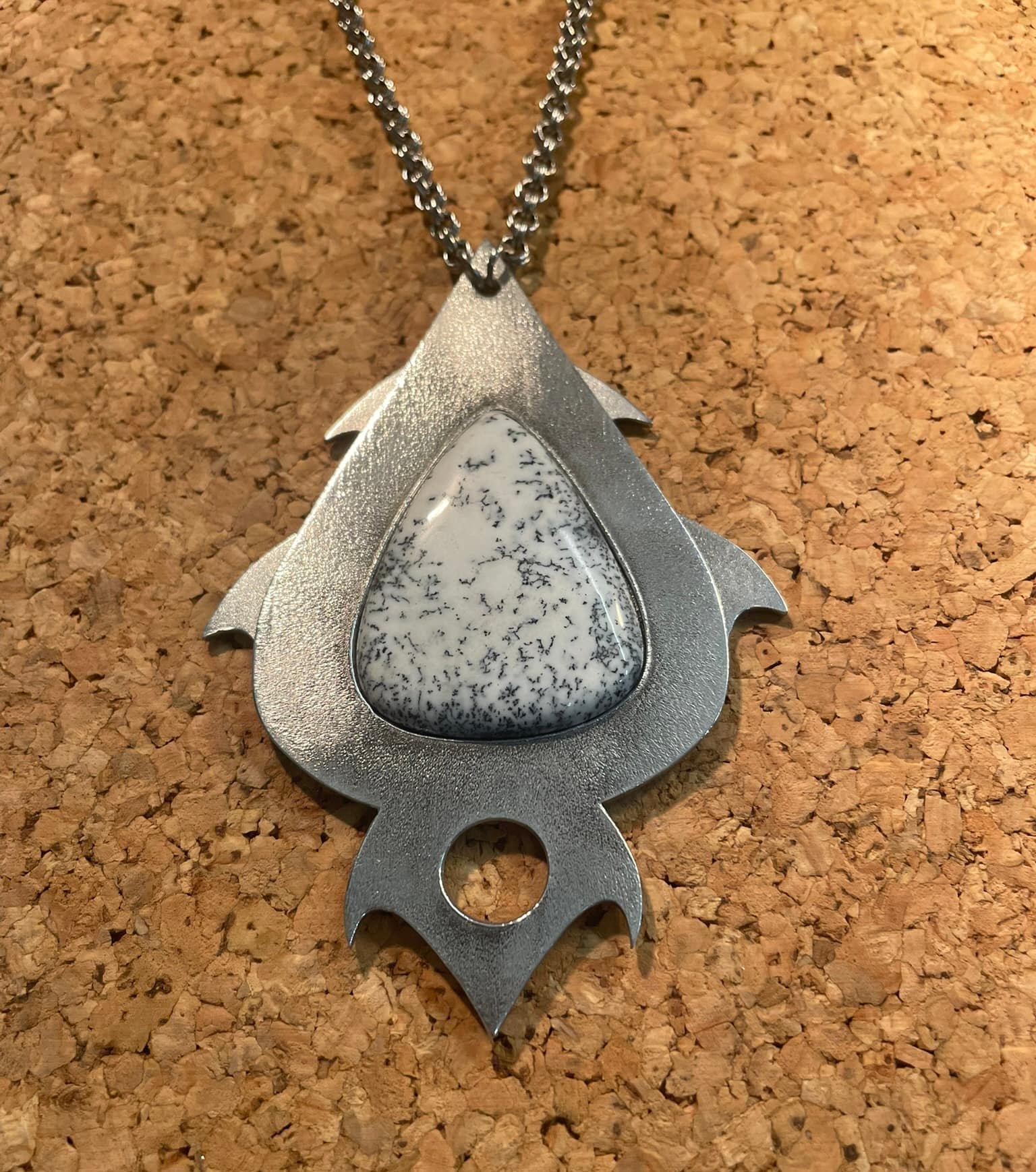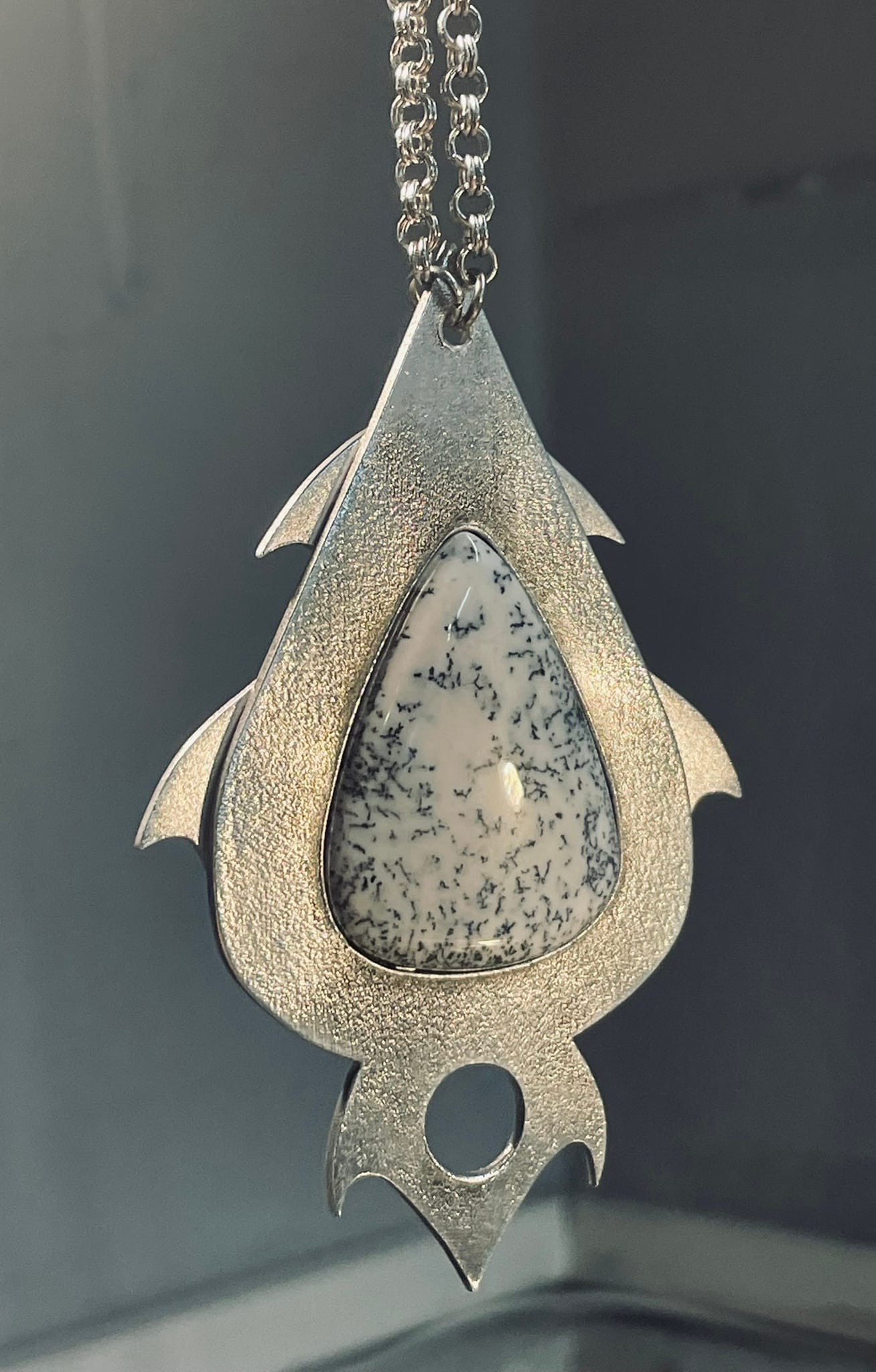Dans la collection Cyber Stones, ce pendentif mélange des courbes issues de la science-fiction et d’un univers tribal. Le tout adouci par un cabochon d’agate dendritique.